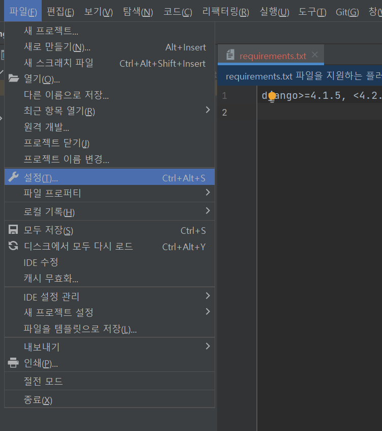 requirements.txt를 pycharm IDE에서 상단에 나타나는 노란색 bar를 클릭해서 설치하려는 경우에