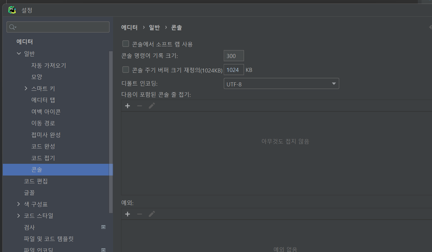 1. settings > editor > general > console 에서 utf-8로 변경