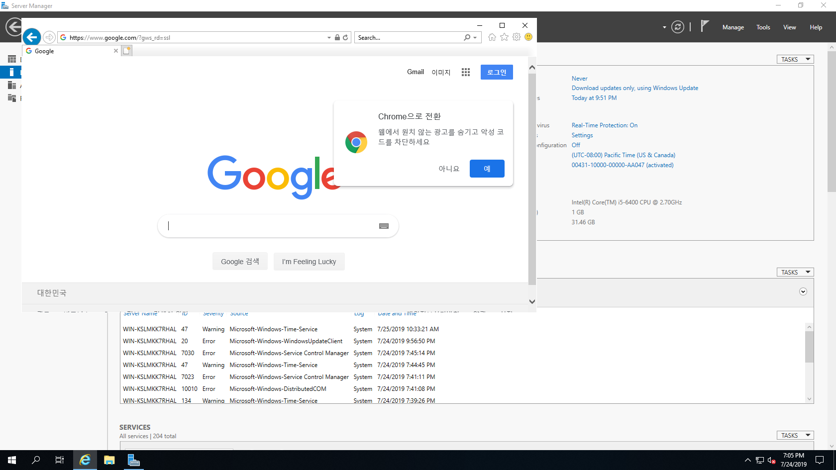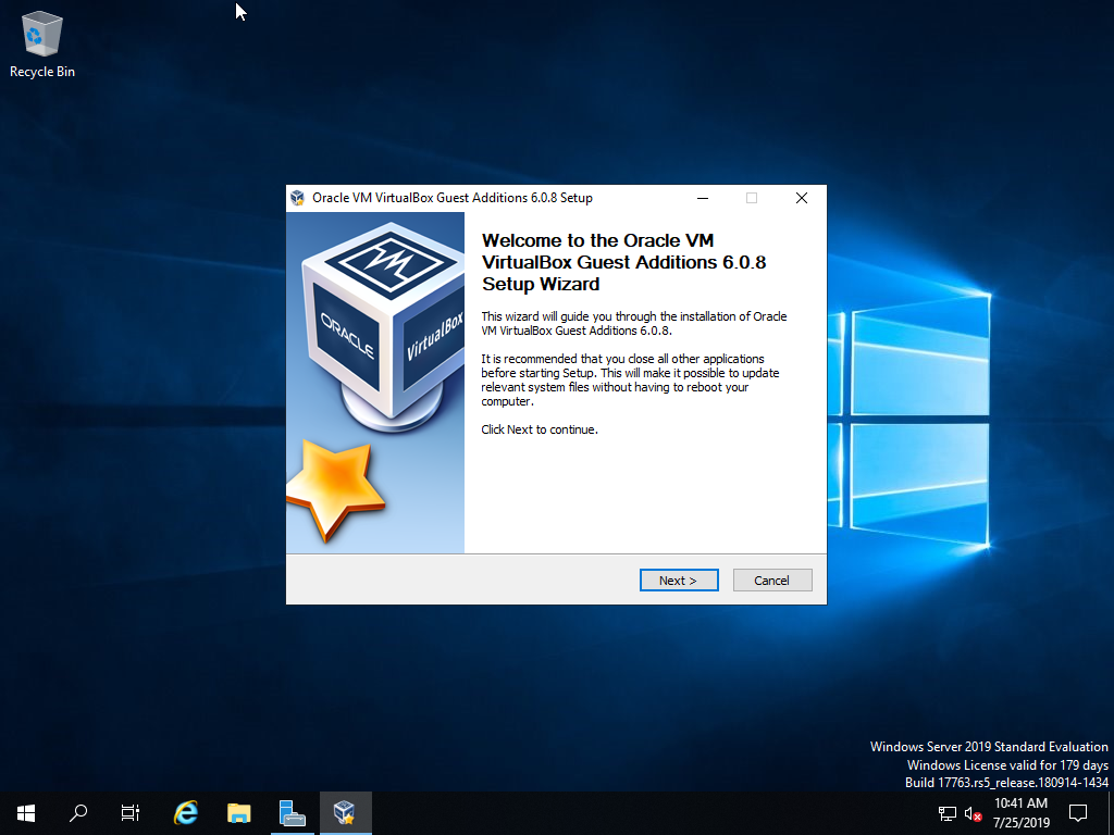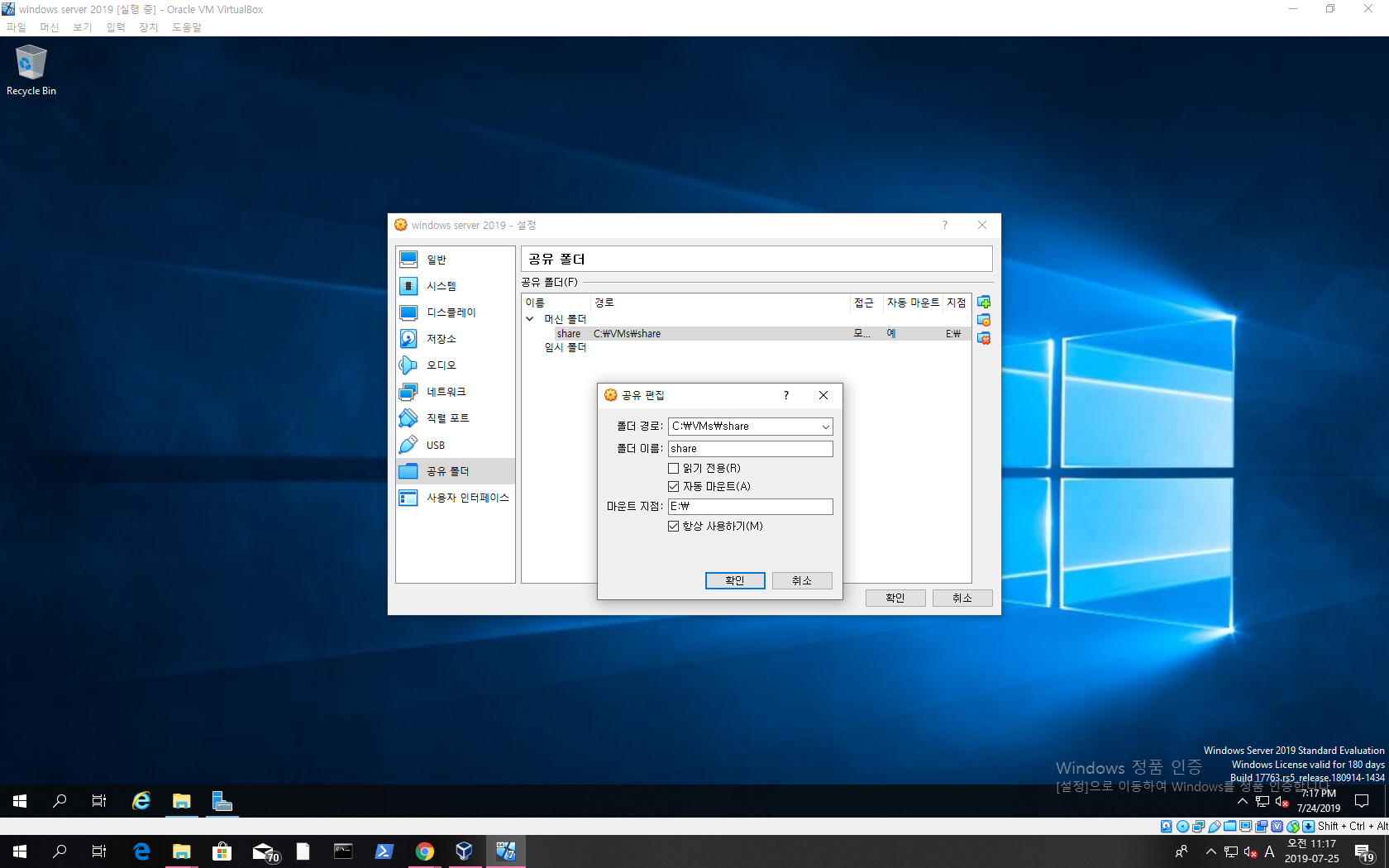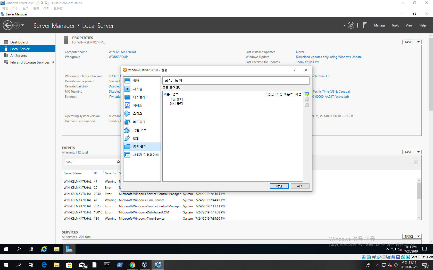 Virtual Box에서 Windows Server 2019 서버를 실행합니다.