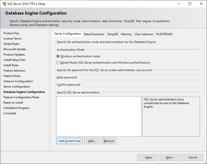 next를 누르다가 Database Engine Configuration이 나오면, Add Current User를 눌러서 현재의 사용자를 관리자로 지정합니다.