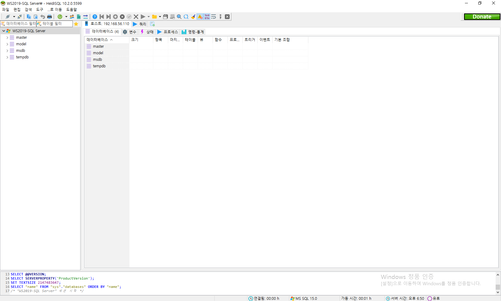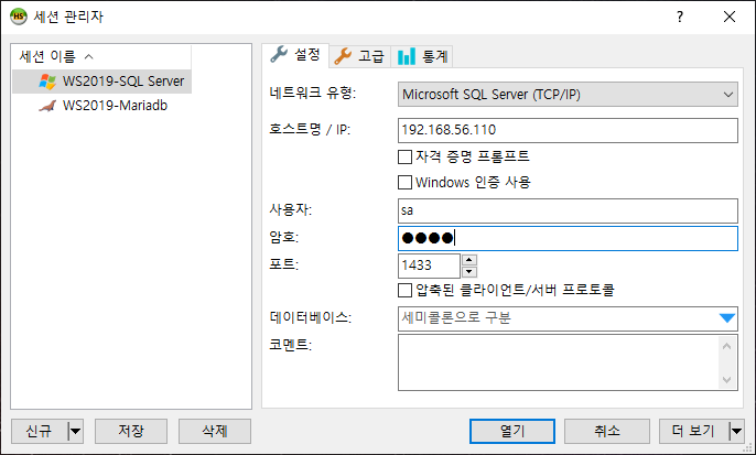 heidiSQL을 실행해서, 새로 WS2019-SQL Server라고 새로운 세션을 만들어준 다음, 위와 같이 설정해 줍시다.