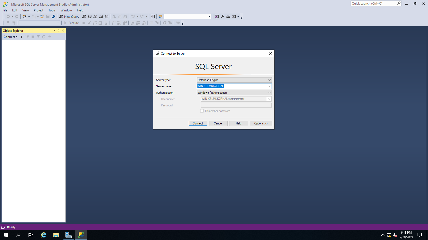 위와 같이 Server name이 컴퓨터 이름으로 들어가 있어도 되고, local에 접속하려고 한다면 .으로 입력해도 됩니다.