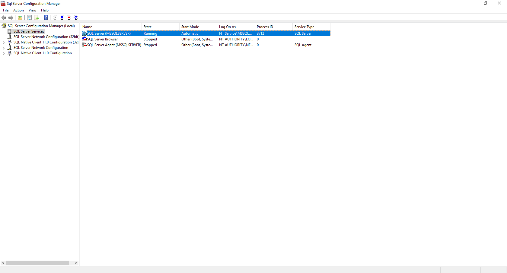 왼쪽 가장 위의 SQL Server(MSSQLSERVER)를 선택해서 실행해주면 서버가 동작합니다.