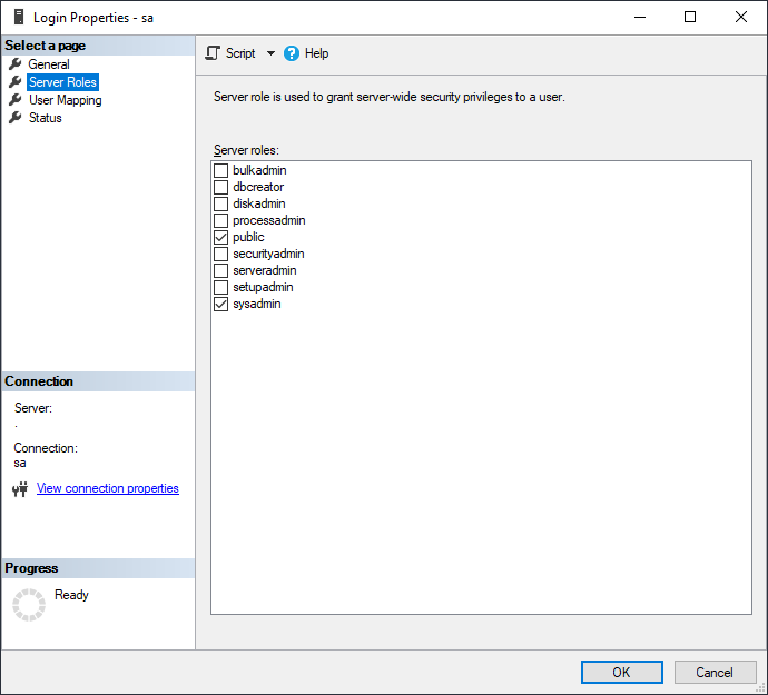 Server Roles에서 sysadmin이 있는 것을 확인하고 OK를 눌러줍니다.