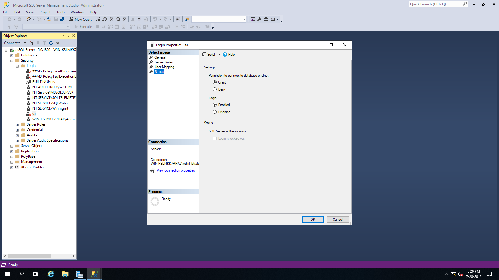 왼쪽 패널 > Security > Logins > sa 오른쪽 클릭 > Properties > Status