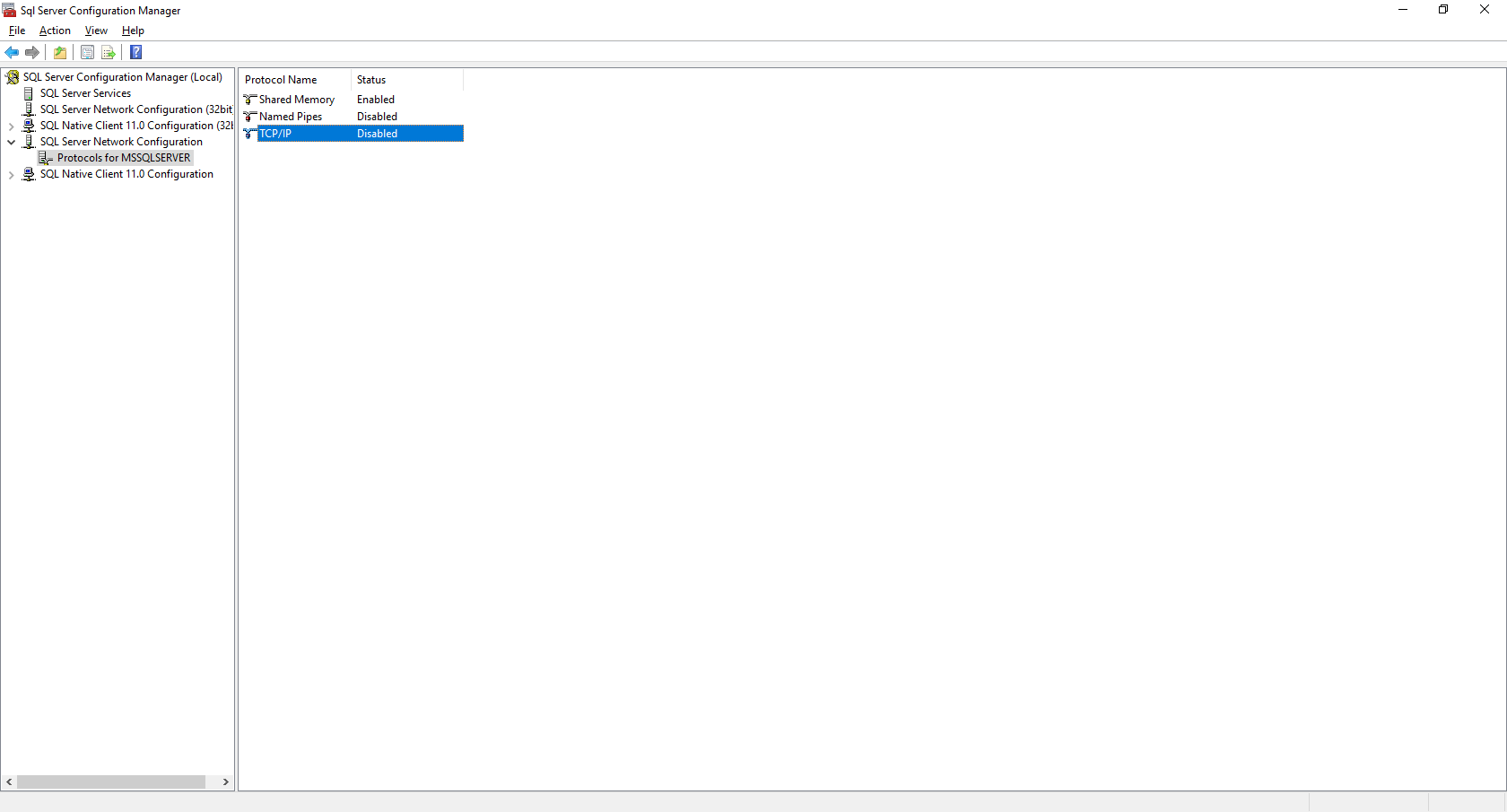 왼쪽 패널 > SQL Server Network Configuration > Protocols for MSSQL SERVER > TCP/IP Enabled