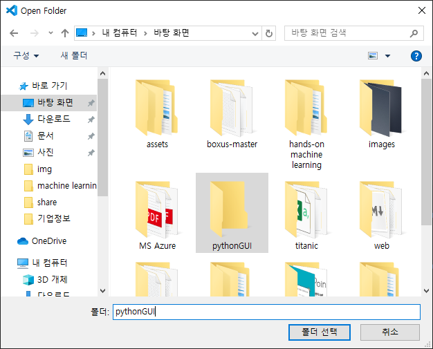 Open Folder를 눌러서 바탕화면에 pythonGUI라는 폴더를 만들었습니다. 앞으로 여기에 프로그램에 관련된 것을 저장하도록 하겠습니다. 폴더 선택을 합니다.