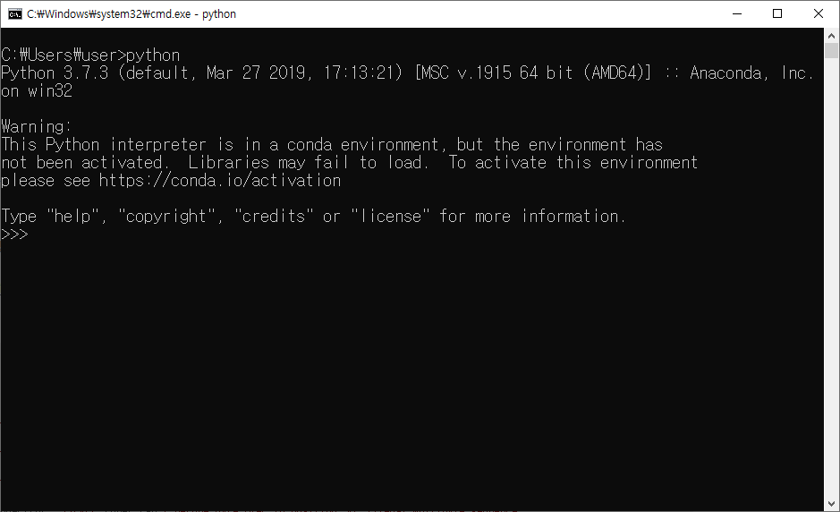 python은 Anaconda 배포판의 3.7.3 버젼으로 설치되어 있습니다.